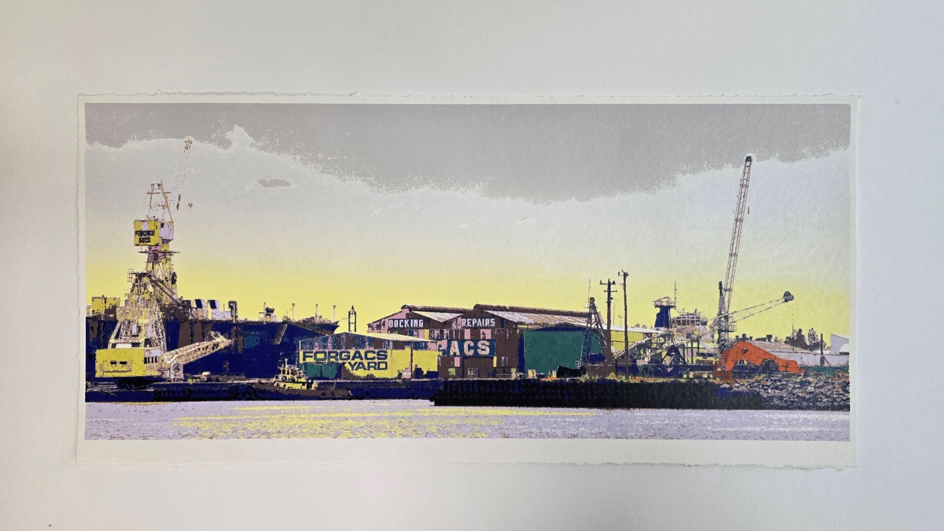 This is a 15 colour screen print depicting the former Forgacs shipyard in Newcastle, Australia.